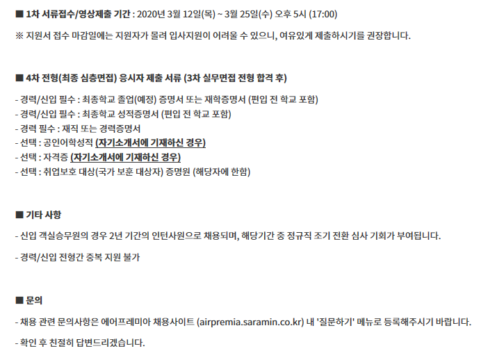 관심있는 예비승무원들께서는 2020년 3월 25일 오후5시까지 지원 가능합니다.