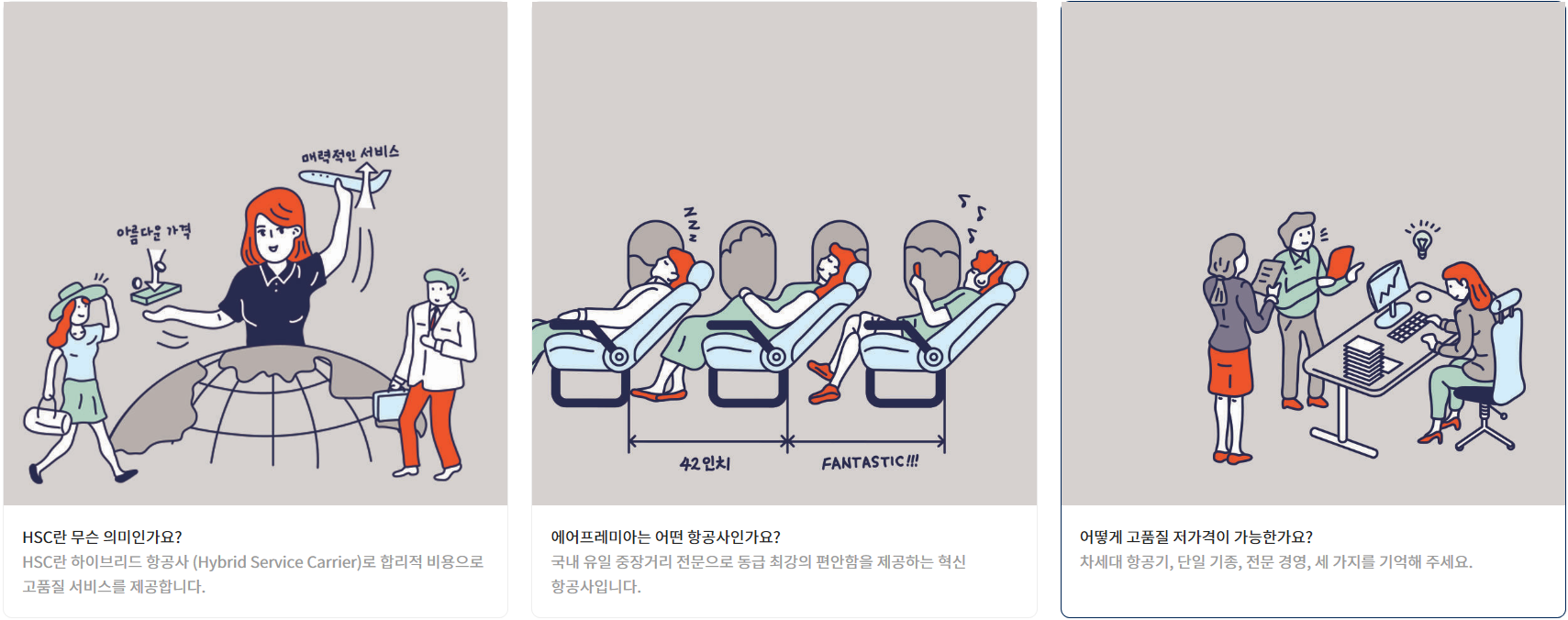 에어프레미아는 국내 유일의 중장거리 전문 HSC 하이브리드 서비스 항공사힙니다.